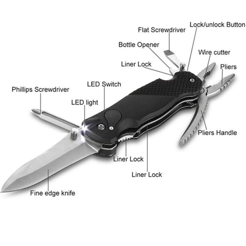 Versatile and Multi-function tools including Pliers, Wire cutter, Fine edge knife, Phillips Screwdriver, flat Screwdriver, Bottle Opener,LED light.